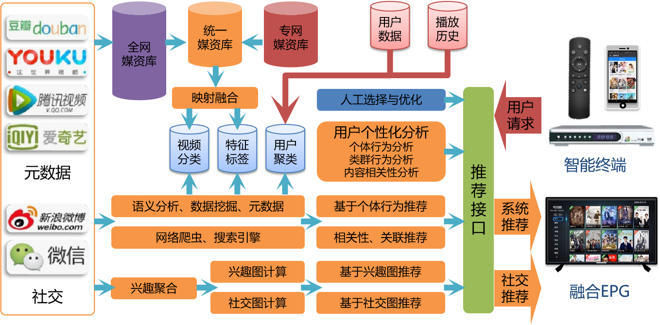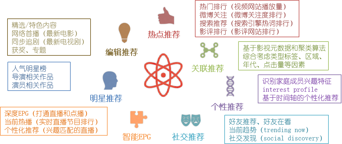 7)智能EPG(以节目和用户为中心):深度EPG(打通直播和点播)、当前热播(实时的直播节目排行)、个性化推荐(与用户兴趣匹配的直播节目),实现直播节目化和直播到点播的导流。