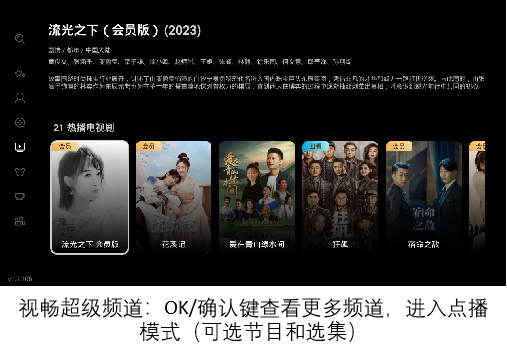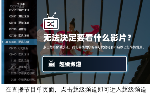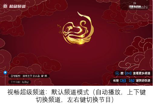 频道模式:进入超级频道后根据用户喜好自动播放内容,可以上下切换专题频道,左右切换节目/剧集,点击OK弹出超级频道列表。
