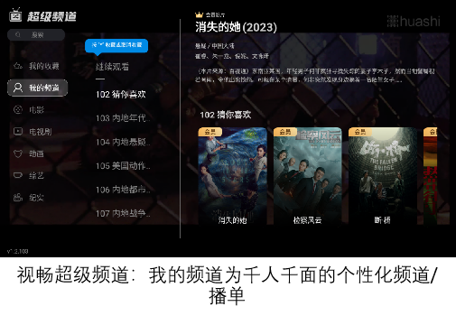 频道内容如下:”我的频道“展示针对当前用户的个性化内容,包含继续观看的节目和频道、短期行为的猜你喜欢频道、长期行为的个性化频道等,用户可以更快速找到自己感兴趣的内容。内容以点播为主,7天回看作为内容补充。