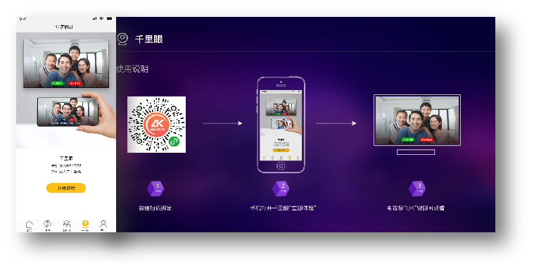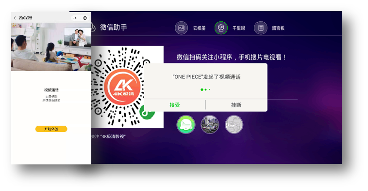 视频通话:利用手机作为摄像头和麦克风实现大屏之间的视频通话,画面更大,让用户可与家人畅谈生活趣事,拉近彼此之间的距离。