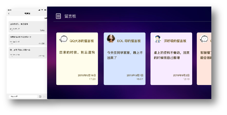 留言板:用户通过微信电视小程序编辑和发送留言信息,留言即时显现在电视大屏端,可达到提醒其他家庭成员今日待办事项和表示日常关心问候的目的。