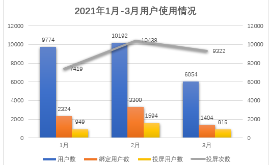 截止2021年3月,“来点微电视”月均增长用户数8673,月均绑定用户数2343,月均投屏次数9060,月均投屏用户数1154,平均每个用户投屏7.85次,用户投屏使用频率相对较高。