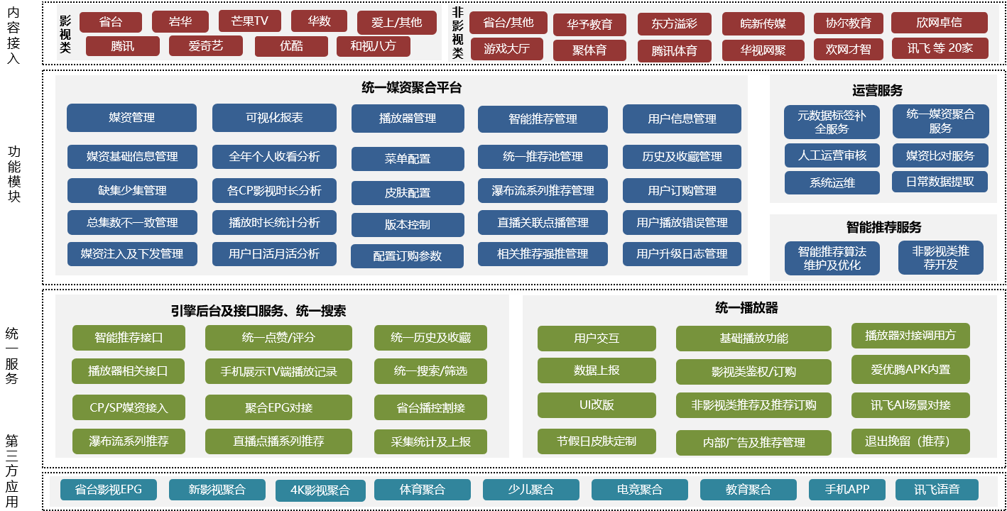 国内首家融合大包案例,安徽电信统一引擎项目(统一媒资+统一搜索+智能推荐+统一播放器+融合EPG门户),聚合7家SP付费点播内容(华数、百视通、优朋普乐、芒果TV、优酷、爱奇艺、腾讯),SP既有独立入口又作为CP被聚合,实现直播、回看和多SP点播内容的统一搜索、智能推荐(个性化推荐、关联推荐和热点推荐)和智能EPG(直播和点播打通,直播到付费点播的导流)。29元/月的影视大包可以观看所有内容(基于触发订购和观看时长进行分账),2017年5月17日上线3个月订购用户突破50万,付费点播收入提升2-3倍。