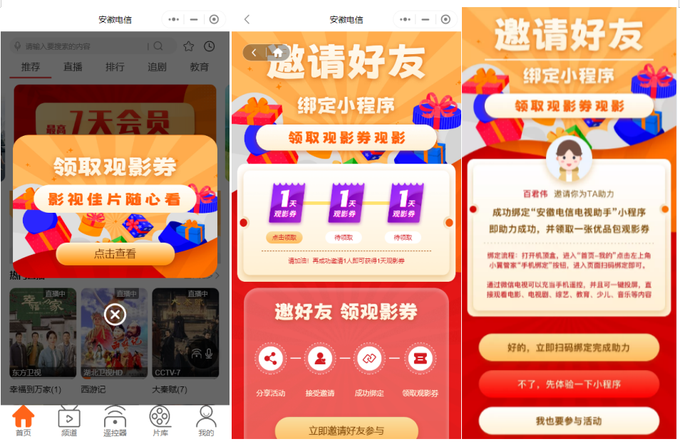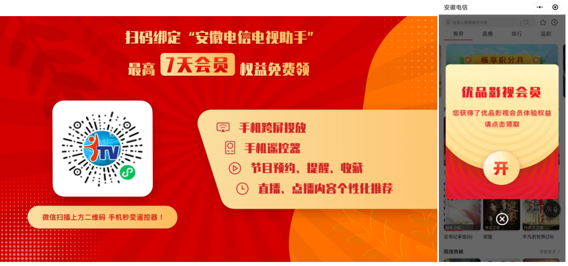 安徽电信电视助手,可以通过小屏触达用户,并从小屏向大屏引流,激活用户回归大屏。