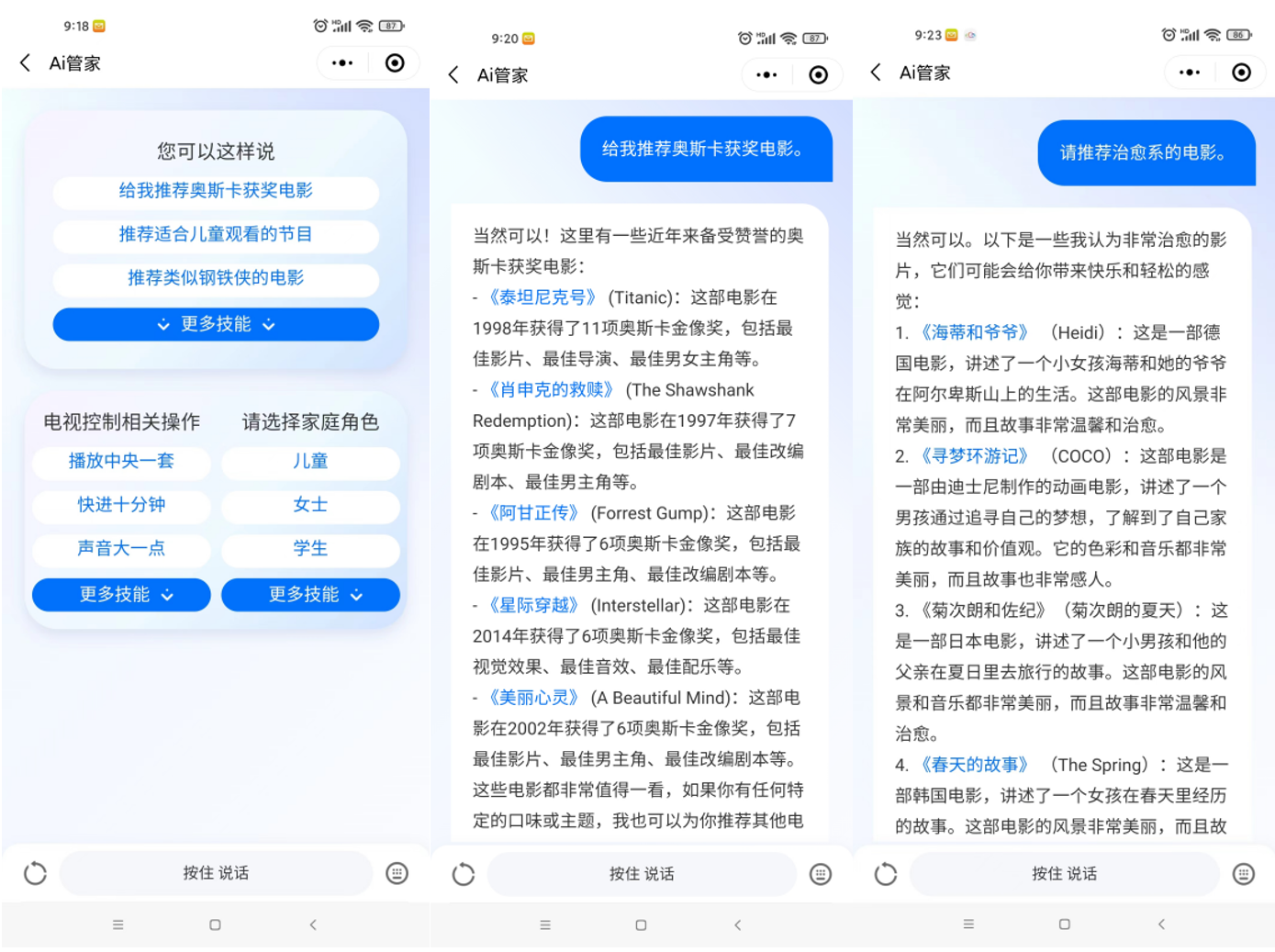 AI大模型+微信电视=AI管家,实现全新的大小屏交互和自然语言交互(GUI图形用户界面和LUI语言用户界面混合的交互形式),有机融合大模型问答和领域知识搜索,支持语音或文字输入,可以和AI进行多轮对话,控制大屏电视,扮演家庭角色,影视内容一键投屏观看。