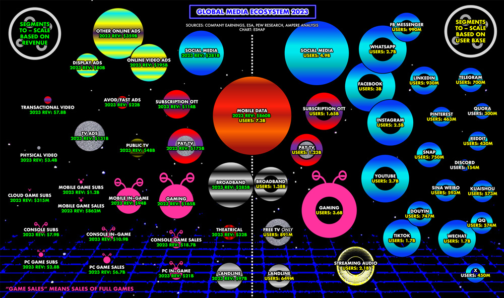 2023年全球媒体生态(左侧基于营收,右侧基于用户规模,来自Evan Shapiro)