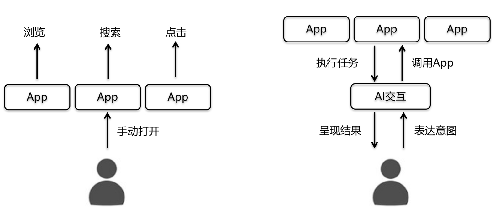 以用户为中心的AI交互(Intent-based LUI+GUI):左为旧范式,右为新范式