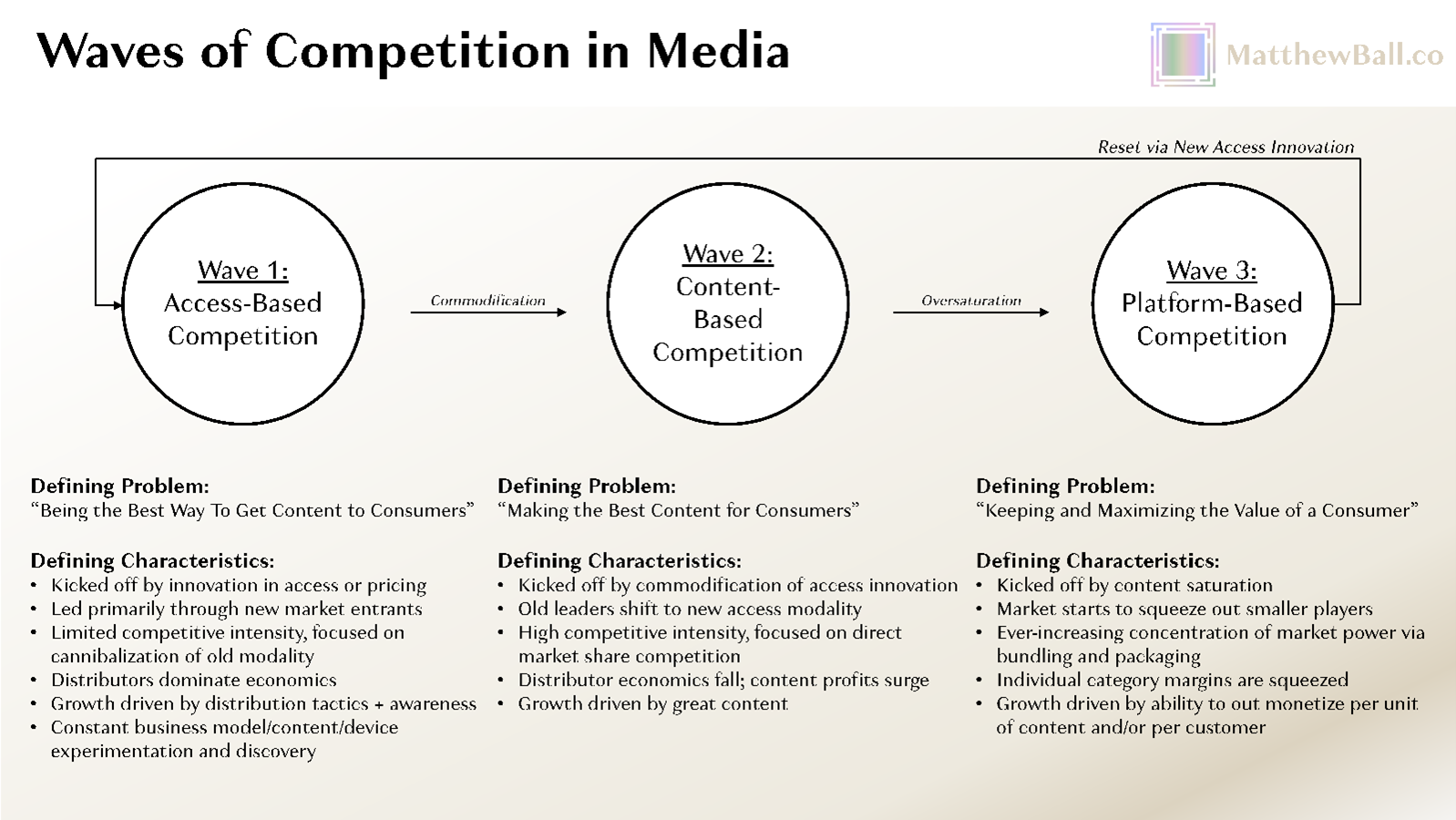 电视的发展史,从访问(传输或分发)模式的技术创新开始,其竞争经历从访问到内容的转变和从内容到平台的转变。从1925年第一台电视机问世,除了电视机本身随着显示技术而进步(从黑白到彩色,从电子管、晶体管到集成电路,从CRT到LCD和OLED,分辨率从标清、高清到超高清4K和8K),传输技术(从广播电视,到有线电视,再到流媒体)为电视带来变革和繁荣。
